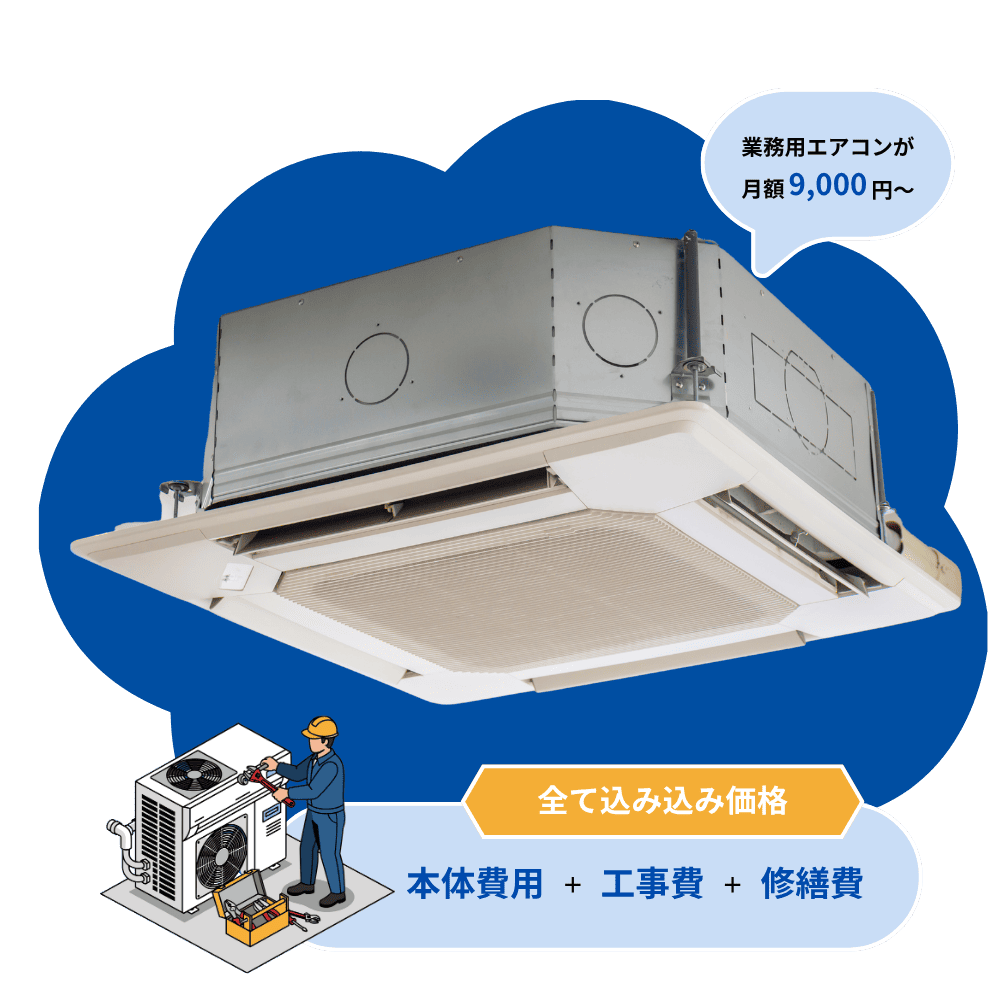 月額費用9,000円(税別)〜の低価格でエアコンを導入することができ、「本体」+「工事費」全て込々価格で安心したエアコンの導入・設置が可能です。